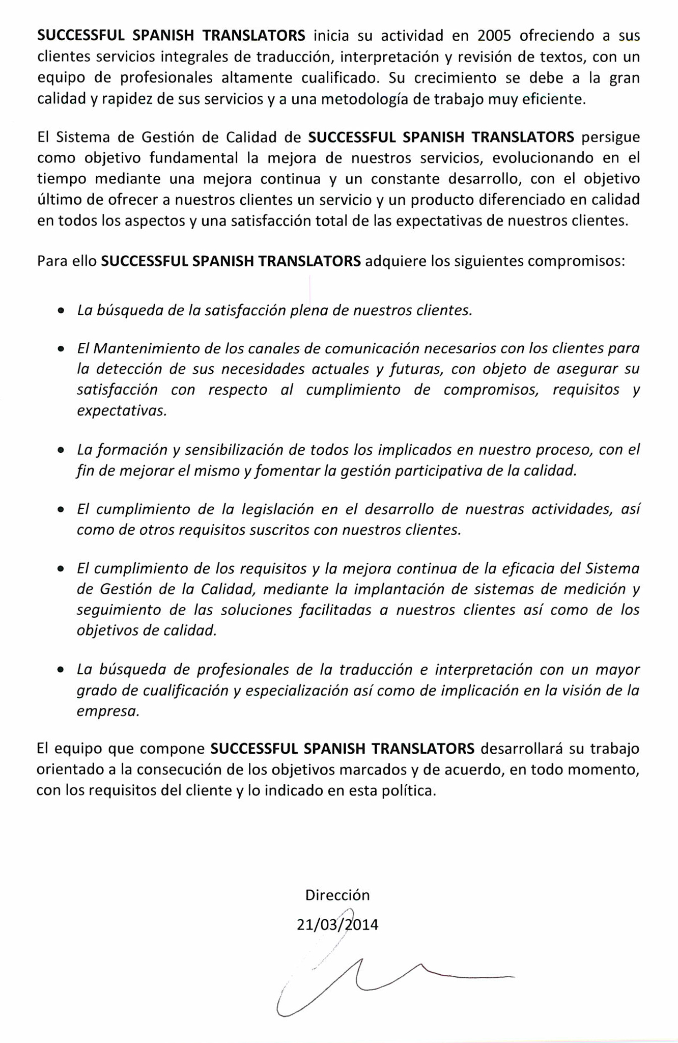 In Succesful Spanish Translators, S.L. through its trademark Dixit, we follow strict management, translation and interpretation procedures in order to keep improving our services and satisfy our clients’ needs. Likewise, these procedures comply with our QUALITY POLICY oriented to guarantee an excellent service to our clients, a continuous improvement and constant development.